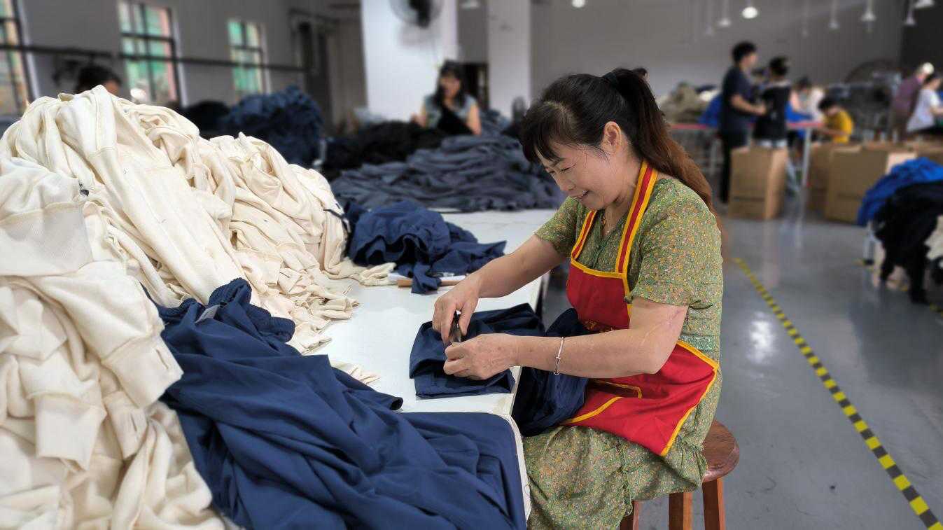 来自融水永乐镇的李阿姨正在对裤子进行线头修剪