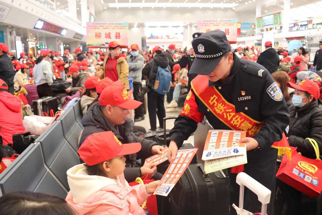 当天一大早,各县区安排专车接送赴粤返岗务工人员直达柳州火车站。出发前,柳州市人社、民宗委、农业农村、团市委等有关部门围绕就业创业、劳动维权、预防诈骗等方面知识为返岗务工人员开展现场培训,并为务工人员送上“暖心政策物资包”,配备了具有柳州特色的“螺蛳饭”,让外出务工人员一路感受到家乡的牵挂和温暖。