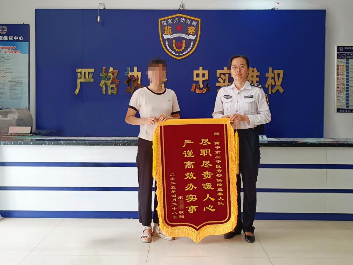 近日,南宁市兴宁区劳动维权大厅内,宋女士手持一面写有“尽职尽责暖人心 严谨高效办实事”的锦旗,专程送到兴宁区人力资源和社会保障局工作人员手中,以此表达对工作人员帮助自己追回被拖欠工资的感激之情。