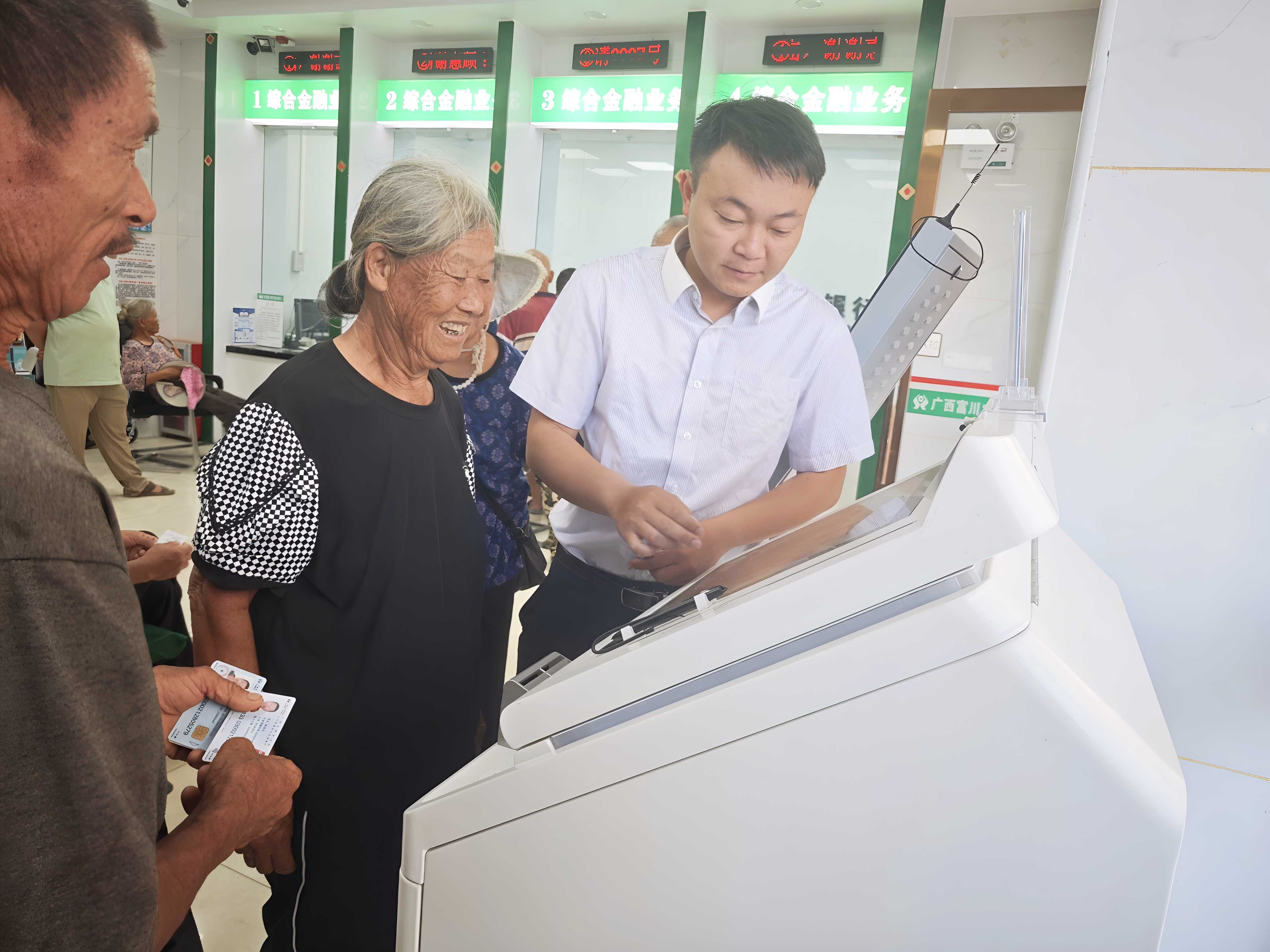 近日,贺州市富川瑶族自治县聚焦老年群体的“急难愁盼”问题,深化服务破解社保待遇资格认证难题,开通社银一体机,将认证服务延伸至各农商银行网点,让老年人在存取款时即可完成社保认证,改变以往认证“步骤多、操作难”的局面。