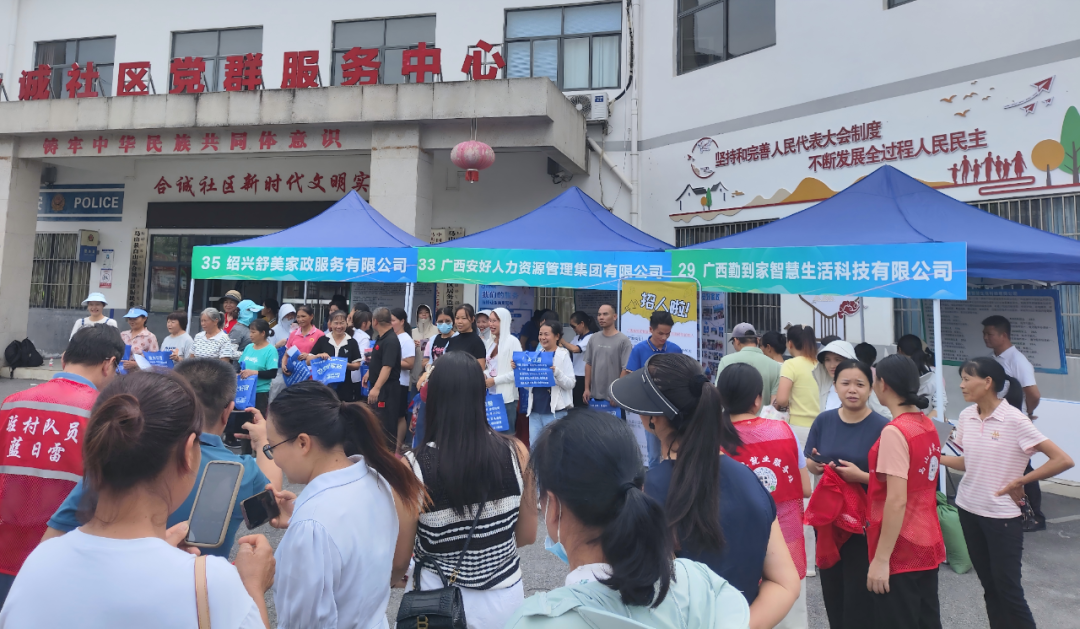为帮助脱贫劳动力、退役军人、留守妇女、搬迁群众等重点群体实现高质量充分就业,在南宁市马山县白山镇易地搬迁安置区合诚社区党群综合服务中心举办粤桂“南粤家政”专场招聘会,29家两广家政企业现场提供家政类就业岗位1000余个,吸引群众到场咨询1200多人次。现场设置了2个政策宣传专区,为群体提供全方位服务。