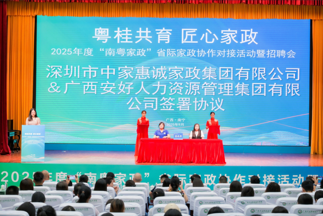9月12日至13日,2025年度“南粤家政”省际家政协作对接活动暨招聘会在广西南宁顺利举办。此次活动由广西壮族自治区人力资源和社会保障厅、广东省人力资源和社会保障厅联合主办,广西壮族自治区就业服务中心、广东省就业服务管理局共同承办,多家校企单位协同协办。活动旨在深入推进东西部协作战略,落实粤桂东西部协作联席会议精神,为粤桂两地家政服务业搭建高效合作桥梁,助力实现更高质量就业。