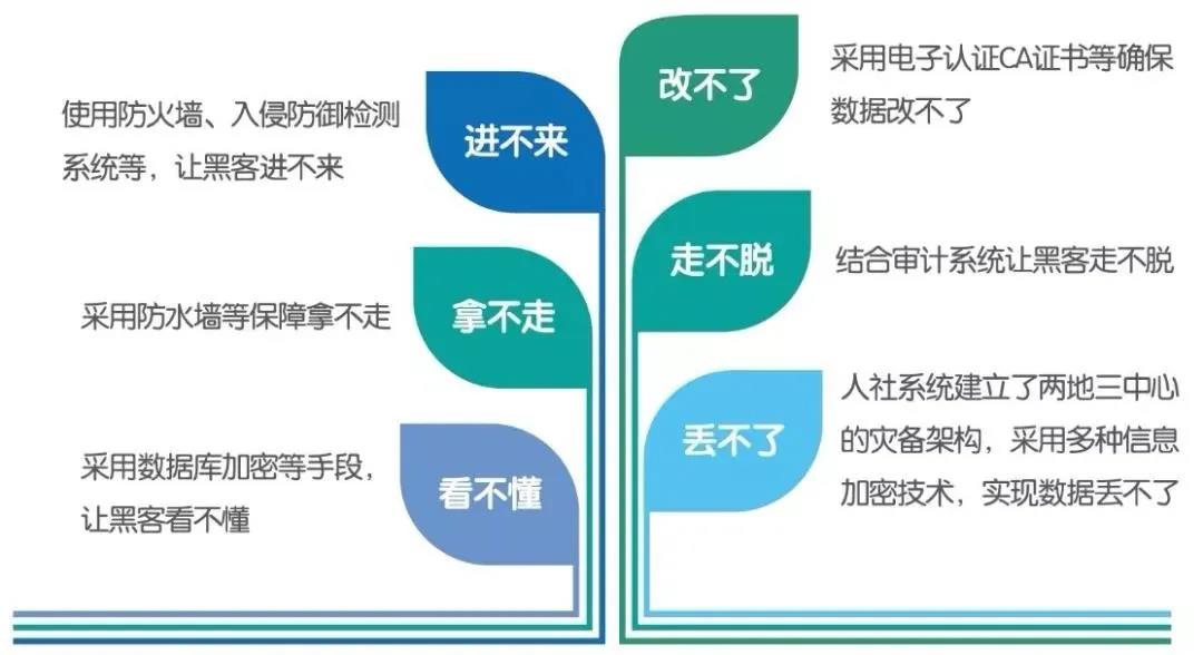 各级人社信息化部门按照统一规划和部署,构建了全方位的信息安全保障体系,全力保障人社个人信息安全。