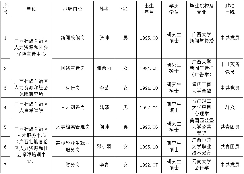 根据《广西壮族自治区事业单位公开招聘人员实施办法》(桂人社发〔2011〕155号)《广西壮族自治区人力资源和社会保障厅所属事业单位2020年度公开招聘工作人员公告》的有关规定,自治区人力资源和社会保障厅所属事业单位2020 年度公开招聘工作经过资格审查、面试、考核和体检等程序,拟聘用张帅等7名同志到我厅所属事业单位工作。现对拟聘用人选的有关情况予以公示,公示期为7个工作日。如对拟聘用人选有异议的,请以书面形式并署真实姓名和联系方式,于2021年3月2日前邮寄或直接送达自治区人力资源和社会保障厅人事处(邮寄以邮戳时间为准)。群众如实反映问题受法律保护。