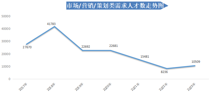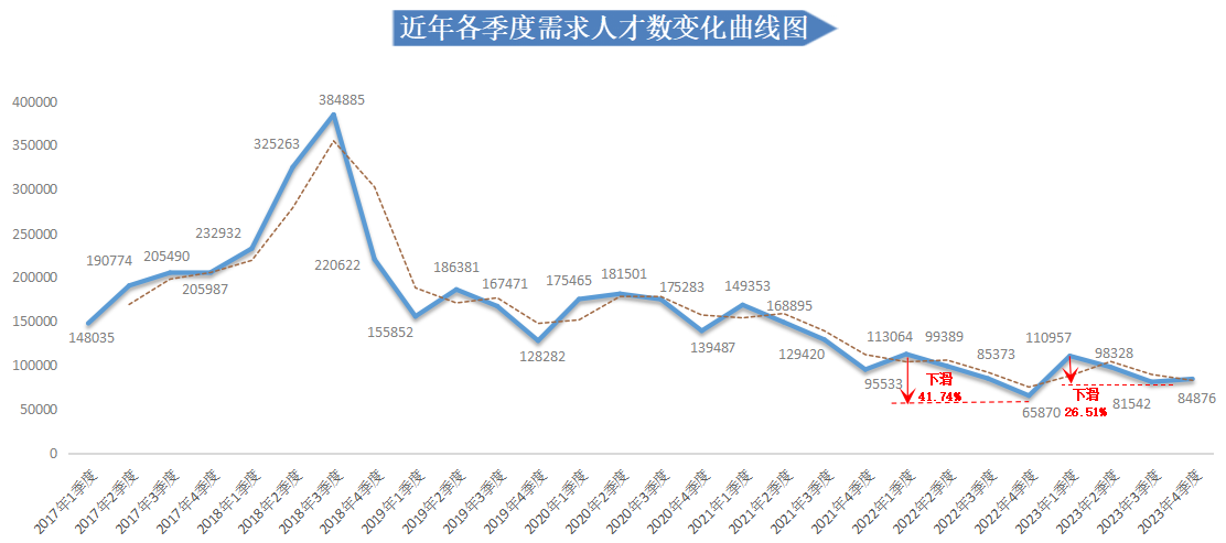 2023年,广西人才网中需求人才数为367752人,与上年度相比减少2669人,微降0.72%,同比降幅收窄30.53个百分点。从季度人才需求变动趋势看,2023年第三季度的人才需求量为年度最低点,为81542人,与一季度相比下滑26.51%;而四季度起一些用人单位开始加大人才储备力度,人才需求量出现回升。