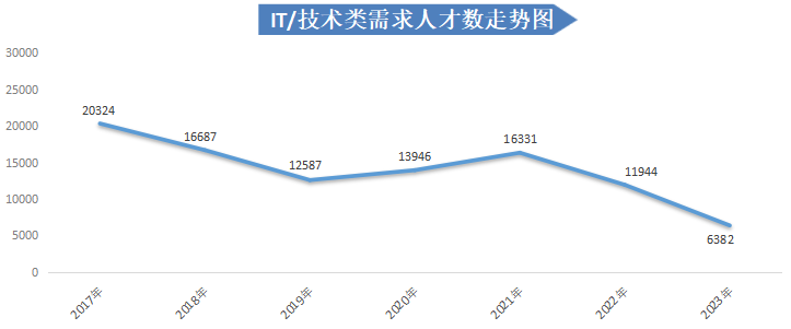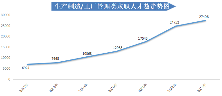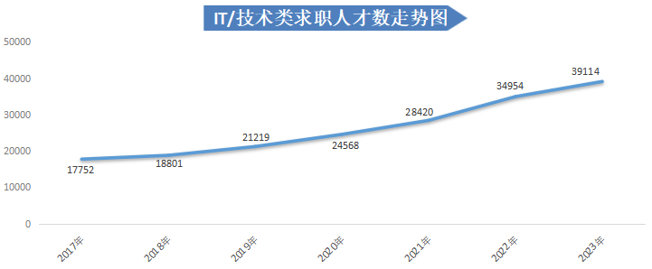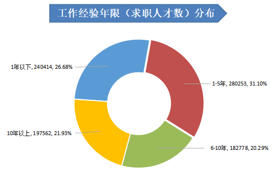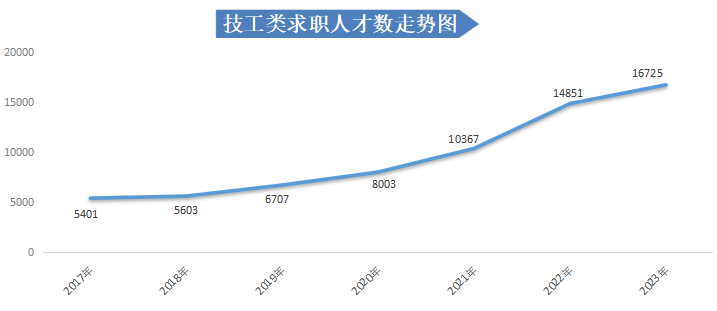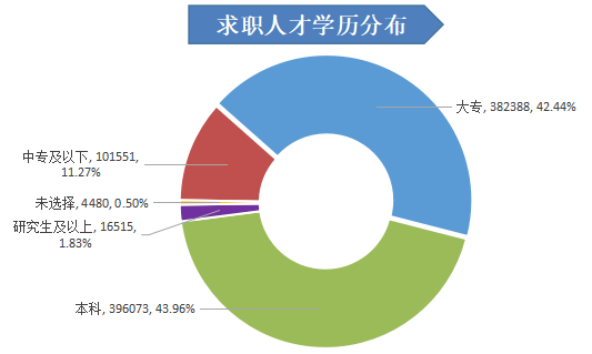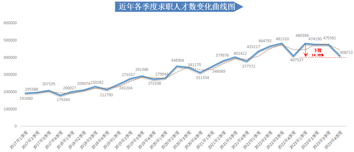 从人才供应量走势看,前四年人才供应量呈快速增长态势,年度增速均在20%左右,2023年人才供应量增速放缓,求职人才数为901007人,与上年度相比小幅增长1.94%。从季度人才供应变动趋势看,2023年前三个季度的人才供应量均在47万人以上,第四季度降至408713人,与一季度相比下滑14.92%。