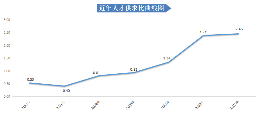 近两年,广西人才网中人才供求比均在2.00以上,超过2个人竞争1个岗位。2023年人才供求比达到2.45,比上年度的2.39微增0.06,人才供求比维持较高水平,总体就业压力仍较大。然而,受行业需求、个人技能和经验等因素影响,各职位类别的竞争程度存在一定差异,传统管理类职位的竞争相对激烈,而技工类、生产制造/工厂管理类、销售类等职位则相对较冷门。