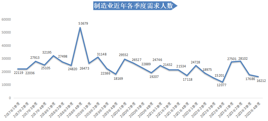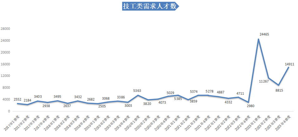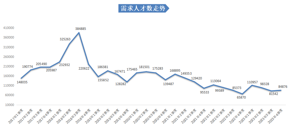 在人才需求方面,2023年第四季度广西人才网中人才需求量出现回升态势,有招聘需求的用人单位需求人才数为84876人,同比增长28.85%,环比增长4.09%。