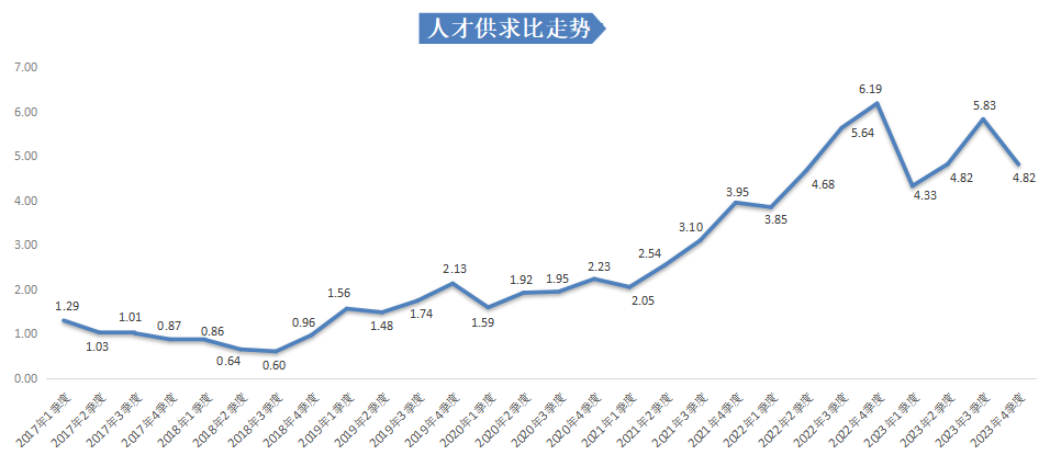 2023年第四季度,广西人才网人才供求比为4.82,与上年同期相比减少1.37,与上季度相比减少1.01,就业压力相对减缓。