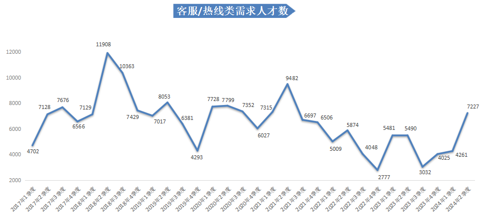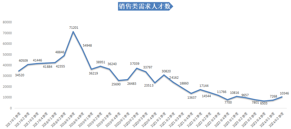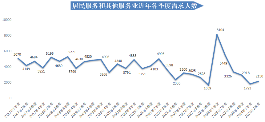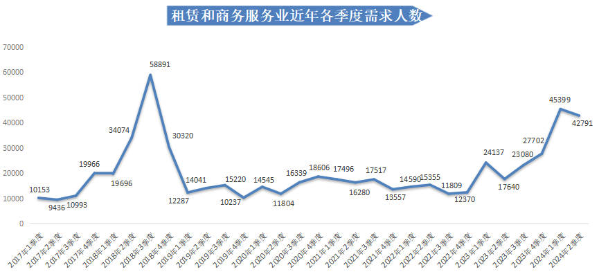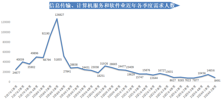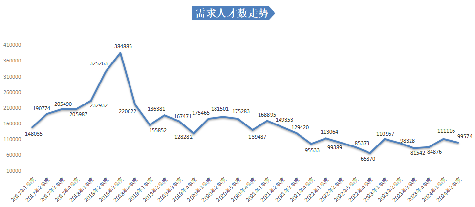 在人才需求方面,人才需求量同比虽有增长,但仍显示出一定的回落态势。2024年第二季度,广西人才网中有招聘需求的用人单位需求人才数为99574人,虽同比小幅增长1.27%,但与上季度相比仍有回落,环比下滑10.39%。
