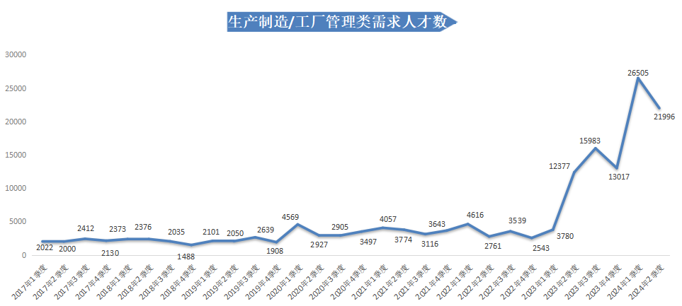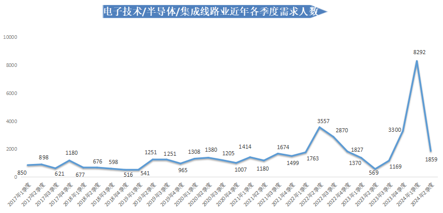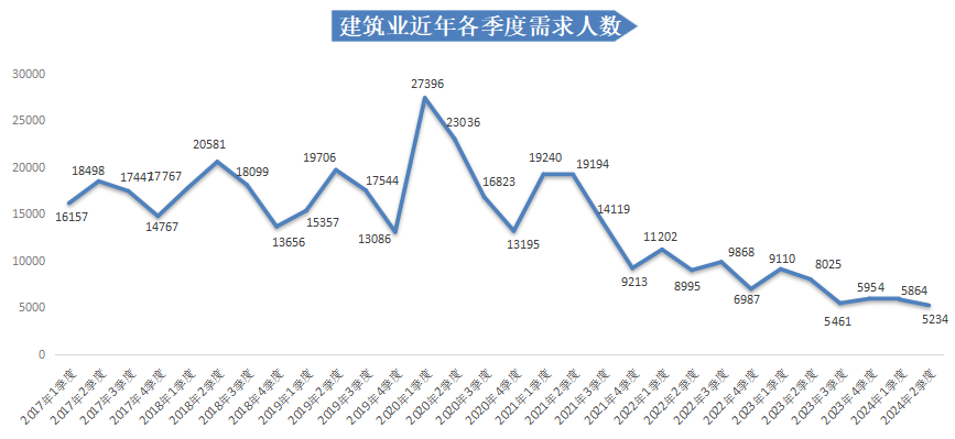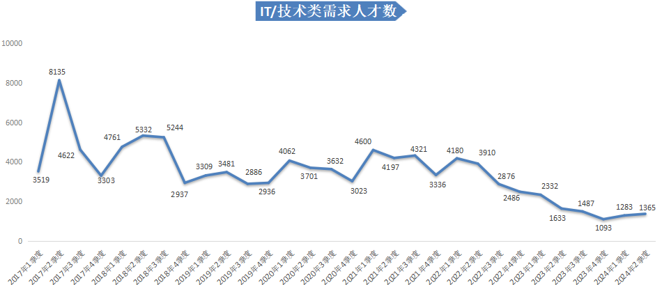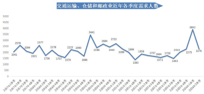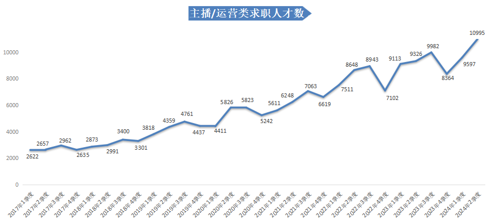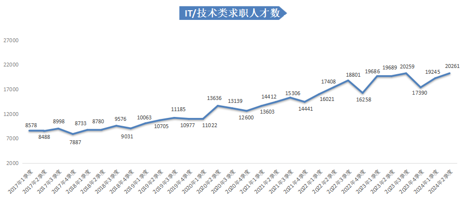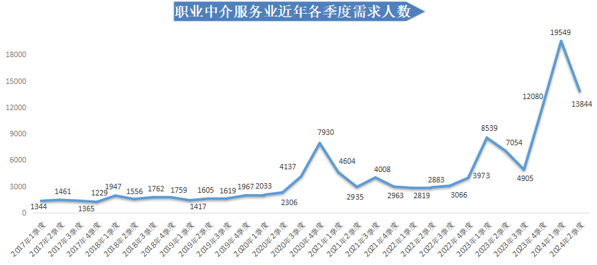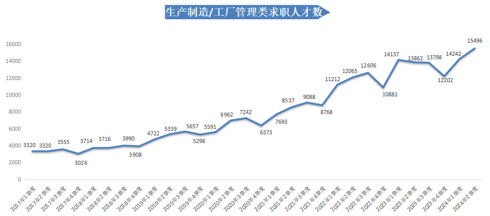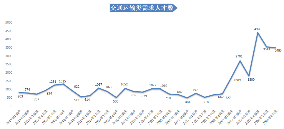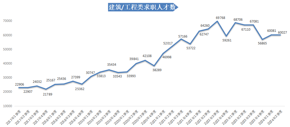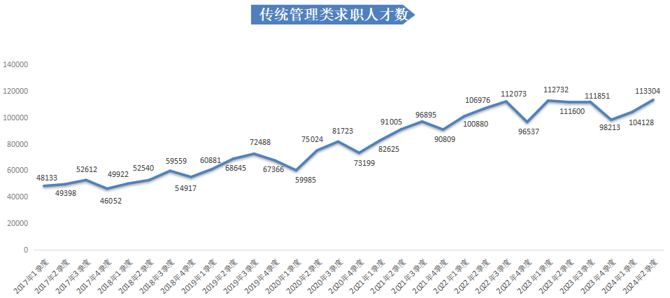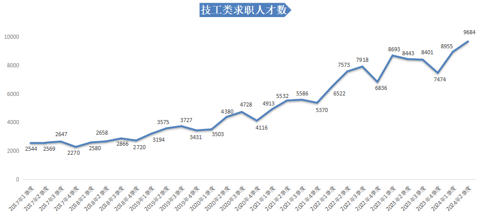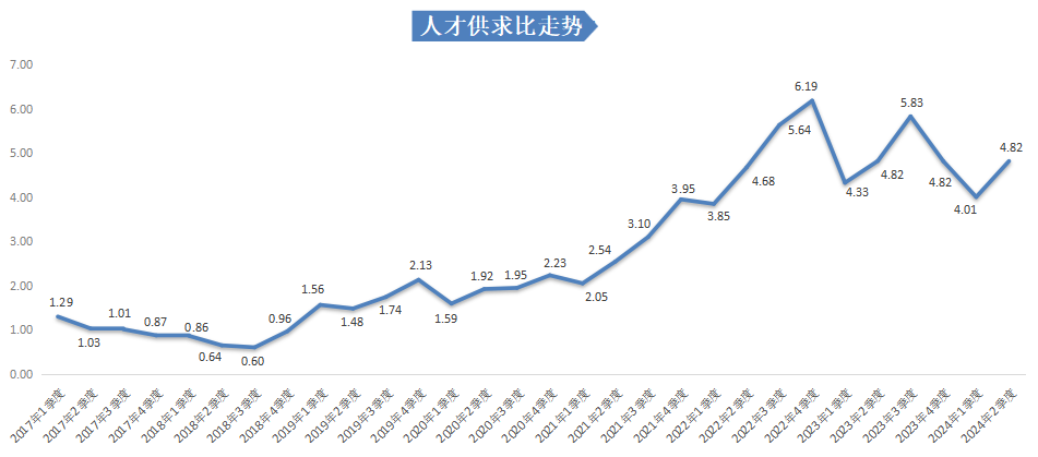 2024年第二季度,广西人才网中人才供求比为4.82,即超过4个人竞争1个岗位。这一比例与去年同期持平,但相较于上季度有所增长,增加了0.81,人才供求比维持在较高水平。
