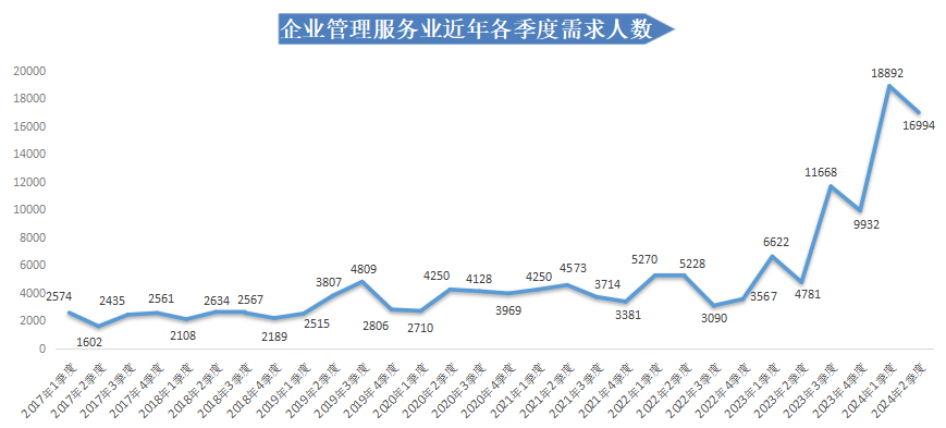 在24个主要行业类别中,有8个行业类别的人才需求相较于上年同期实现不同程度的增长。租赁与商务服务业尤为亮眼,需求人才数比上年同期增加25151人,同比增长142.58%,是本季度人才需求量同比增长最多的行业类别;其次是信息传输、计算机服务和软件业,需求人才数比上年同期增加878人,同比增长11.53%;同比增长量排名第三的是交通运输、仓储和邮政业,需求人才数比上年同期增加784人,同比增长52.55%。
