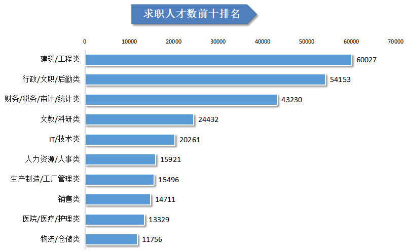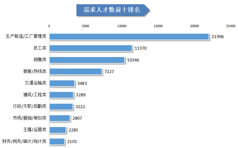 在行业分布中,人才需求量排名前五的行业类别分别为:租赁和商务服务业、制造业、信息传输/计算机服务和软件业、建筑业、房地产业,这五个行业合计需求人才数占比达到77.31%。