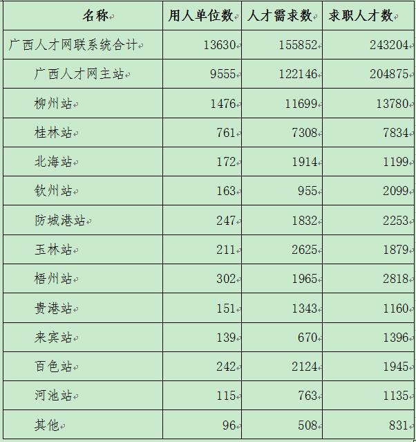 注:广西人才网联系统是以广西人才网站为数据库管理中心,联接广西区内柳州、桂林、玉林、防城港、北海、梧州、钦州、贵港、崇左、来宾、河池、百色、贺州等13个市级人才市场网站,以及平南和桂平等县级人才市场网站,形成数据库共享、服务内容和服务标准统一、基本覆盖广西全区范围的人才供求信息网络服务系统,在广西网上人才交流业务领域具有一定代表性。