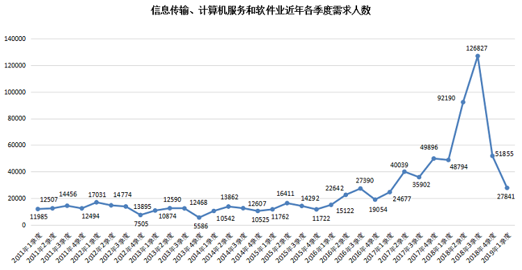 2019年第一季度,广西人才网联系统中信息传输、计算机服务和软件业的人才需求下滑明显,其人才需求量为27841人,比上年同期的48794人减少20953人,大幅下滑42.94%,环比降幅达到46.31%。其中,互联网和电子商务行业的人才需求分别为12823人和6221人,比上年同期分别减少12485人和6829人,同比降幅分别达到49.33%52.33%
