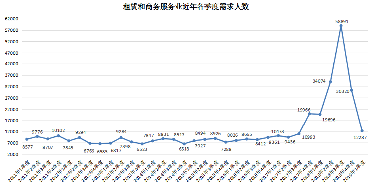 2019年第一季度,租赁和商务服务行业人才需求大幅下跌,需求人才数跌至12287人,与去年同期的19696人相比减少7409人,同比降幅达到37.62%,其中市场管理和职业中介服务业人才需求分别仅为796人和1417人,比上年同期分别减少6339人和530人,同比降幅分别达到88.84%27.22%
