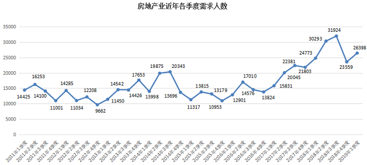 2019年第一季度,房地产业人才需求逆势增长,需求人才数为26398人,与去年同期的24773人相比增加1625人,同比小幅上涨6.56%