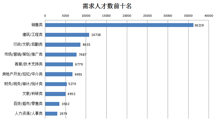 1. 位居需求榜前十名的职位:销售类、建筑/工程类、行政/文职/后勤类、市场/营销/策划/推广类、客服/技术支持类、房地产开发/经纪/中介类、财务/税务/审计/统计类、文教/科研类、百货/超市/零售类、人力资源/人事类等职位类型。这十个职位类型的需求人才数总计93450人,占人才总需求量的59.96%,其中销售类职位需求长期以绝对优势位居首位,其需求人才数达到36219人,占比达到23.24%,但比上年同期的42355人减少6136人,成为本季度需求量减少最大的职位类型,降幅为14.49%