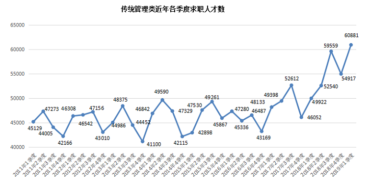 3.三大传统管理类职位的人才供应总量创新高,其求职人才数达到60881人,与上年同期相比增长10959人,同比大幅增长21.95%