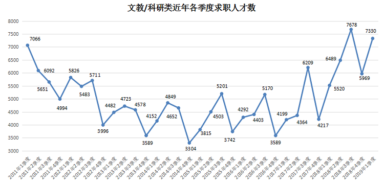 4.文教/科研类职位的求职人才数为7330人,比上年同期增加1810人,同比涨幅达到32.79%