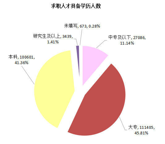 6.广西人才网联系统求职人才学历长期集中在大专和本科学历,其中大专学历求职人才数占比高达45.81%,本科学历求职人才数占比达41.36%,大专和本科学历的求职人才共计212006人,与上年同期的169984人相比增加42022人,增长24.72%