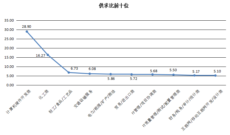 其中,计算机硬件开发类、化工类及轻工/食品/工艺品职位就业竞争压力较大,其供求比分别高达28.9016.276.73,位居供求比前三位;而服务业三类职位和销售类等职位由于人员流动性大等特征,需求长期旺盛,供求比长期位居供求比后十位,其合计供求比分别仅为0.680.44