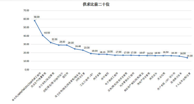 1. 总体供求比为1.56,与上年同期相比增加0.70,其中54个主要职位类型中,人才供求比大于2的职位类型高达35个,其中20个类型的职位竞争激烈,人才供求比大于3
