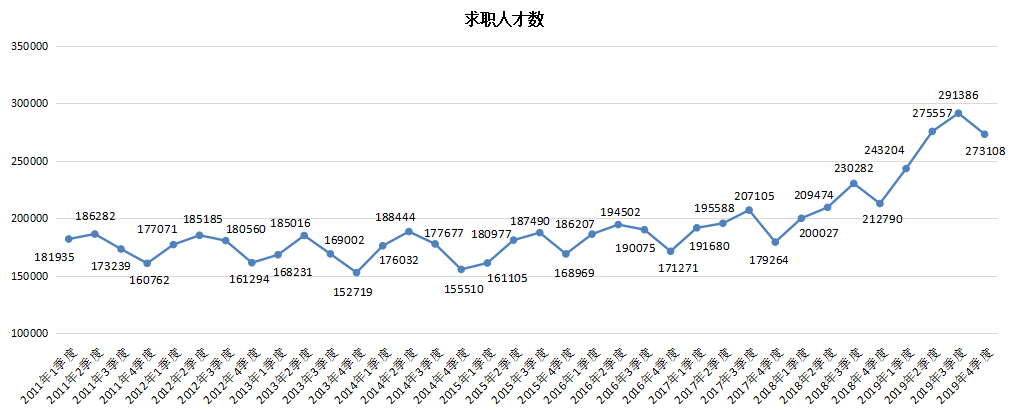 而在人才供给方面,求职人才数保持稳定增长态势,在2019年第四季度达到273108人,虽由于季节性因素下滑6.27%,但仍比上年同期增加60318人,同比增长28.35%。