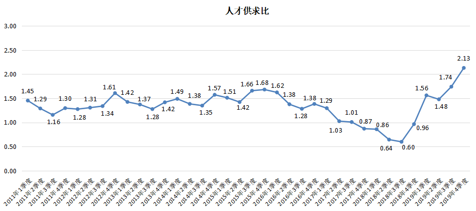 2019年第四季度,广西人才网联系统人才供求比为2.13(即人才需求人数或职位数为1时,人才供给或求职人才数为2.13,下同),比上年同期的0.96增加1.16,就业压力明显增大。