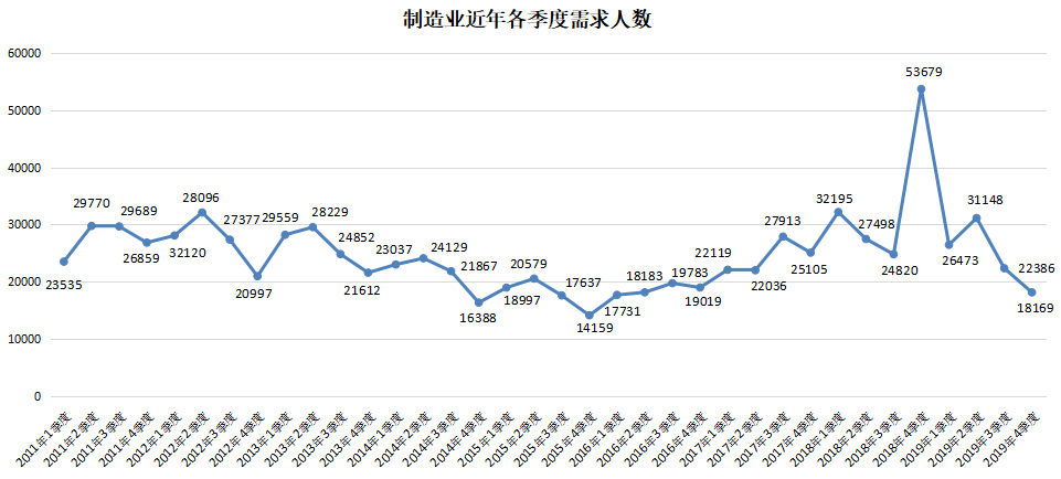 1.制造业的需求人才数为18169人,比上年同期的53679人减少35510人,同比降幅达到66.15%,其中快速消费品行业的需求人才数为5648人,比上年同期的38267人减少32619人,同比降幅达到85.24%,是导致制造业同比下滑的主要原因。