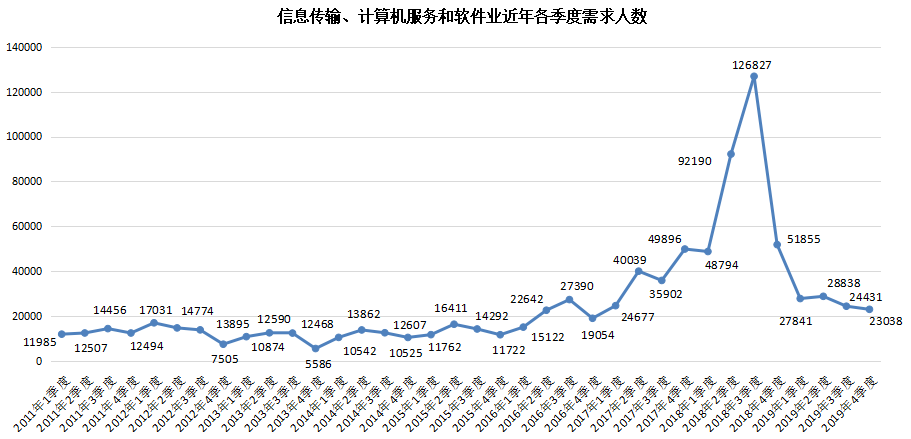 2.信息传输/计算机服务和软件业需求人才数为23038人,比上年同期的51855人减少28817人,同比降幅达到55.57%。其中,互联网和电子商务行业需求人才数分别为4320人和4164人,比上年同期的26774人和16955人分别减少22454人和12791人,同比降幅分别达到83.86%和75.44%。
