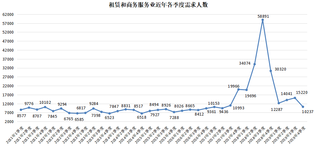 3.租赁和商务服务业需求人才数为10237人,环比下滑32.74%,比上年同期减少20083人,同比下滑66.24%。