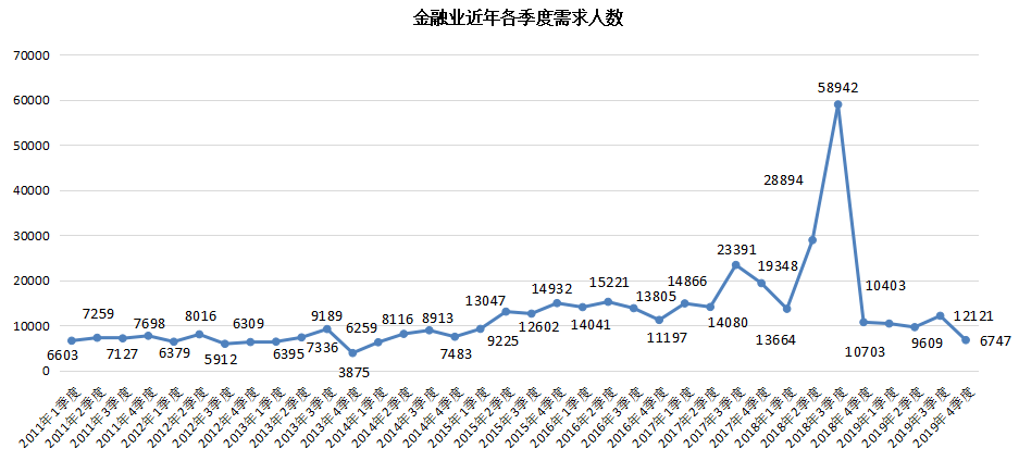 4.金融业人才需求人才数为6747人,环比下滑44.34%,比上年同期的10703人相比减少了3956人,同比下滑36.96%。
