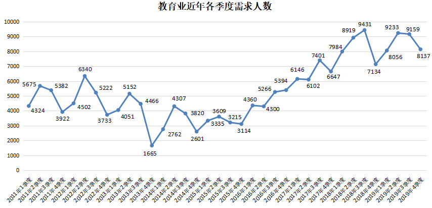 5.教育业人才需求逆势增长,需求人才数为8137人,虽环比下降11.16%,但与上年同期的7134人相比仍增加了1003人,同比上涨14.06%。