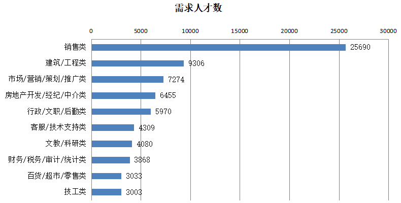 位居需求榜前十名的职位:销售类、建筑/工程类、市场/营销/策划/推广类、房地产开发/经纪/中介类、行政/文职/后勤类、客服/技术支持类、文教/科研类、财务/税务/审计/统计类、百货/超市/零售类、技工类等职位类型。这十个职位类型的需求人才数总计72988人,占人才总需求量的56.90%。