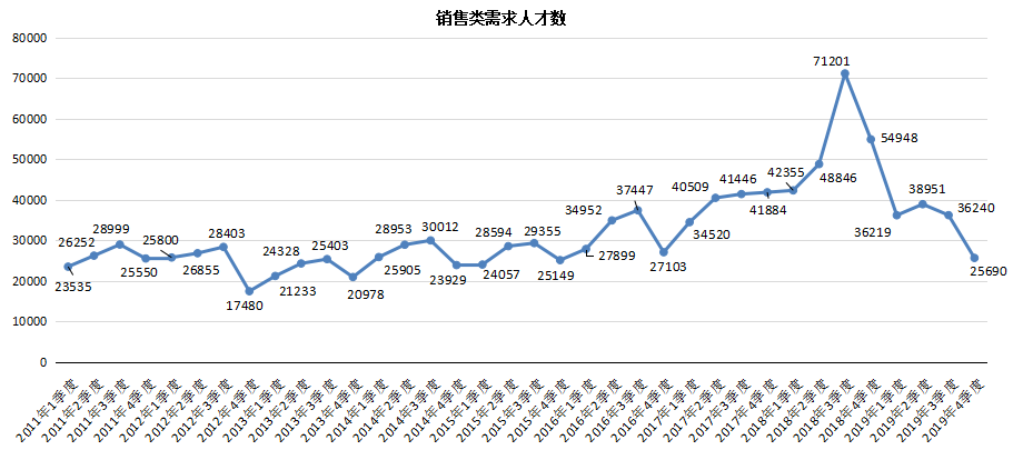 2019年第四季度,销售类职位需求人才数为25690人,比上年同期的54948人减少29258人,同比下滑53.25%,环比下滑29.11%。销售类职位中有超过七成的职位人才需求出现同比下滑,其中下滑幅度较大的有销售代表、推销员/业务员以及招商/渠道/分销/拓展专员等基层职位,同比分别减少12219人、4369人以及3440人,降幅分别达到66.25%、58.46%以及67.12%。