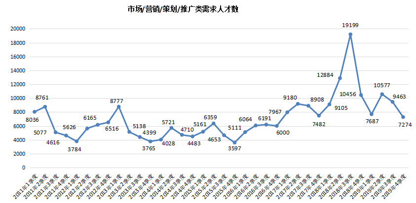 2.市场/营销/策划/推广类职位需求人才数为7274人,与上年同期的10456人相比减少3182人,同比降幅为30.43%。