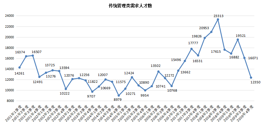 2019年第四季度,广西人才网联系统中传统管理类职位(包含行政/文职/后勤类、人力资源/人事类及财务/税务/审计/统计类等职位类别,下同)的人才需求从上季度开始直线下滑,其人才需求总量为12350人,环比降幅为23.15%,与上年同期相比减少5265人,同比降幅为29.89%。其中行政/文职/后勤类、财务/税务/审计/统计类以及人力资源/人事类的人才需求与上年同期相比分别减少了4029人、661人和575人,同比降幅分别为40.29%、14.59%和18.63%,环比降幅分别为22.78%、27.54%以及16.32%。
