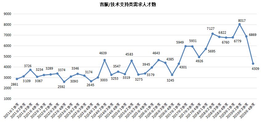 4.客服/技术支持类职位需求人才数为4309人,环比下滑37.27%,比上年同期的6760人相比减少了2451人,同比下滑36.26%。