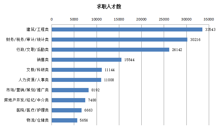 位居求职榜前十名的职位:建筑/工程类、财务/税务/审计/统计类、行政/文职/后勤类、销售类、文教/科研类、人力资源/人事类、市场/营销/策划/推广类、房地产开发/经纪/中介类、医院/医疗/护理类、物流/仓储类等职位类型。这十个职位类型的求职人才数量总计155596人,合计占比达到56.97%。其中,建筑/工程类、财务/税务/审计/统计类及行政/文职/后勤类这三类职位类型的求职人才数稳居前三位,均超过20000人。