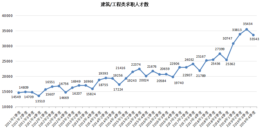 2019年第四季度,广西人才网联系统中建筑/工程类职位的求职人才数为33543人,与去年同期的25362人相比增加8181人,同比增长32.26%。
