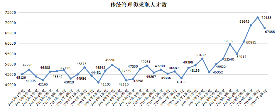 2.三大传统管理类职位(包含行政/文职/后勤类、人力资源/人事类及财务/税务/审计/统计类等职位类别,下同)的人才供应总量为67366人,虽环比下滑7.07%,但仍比上年同期增加12449人,同比增长22.67%。