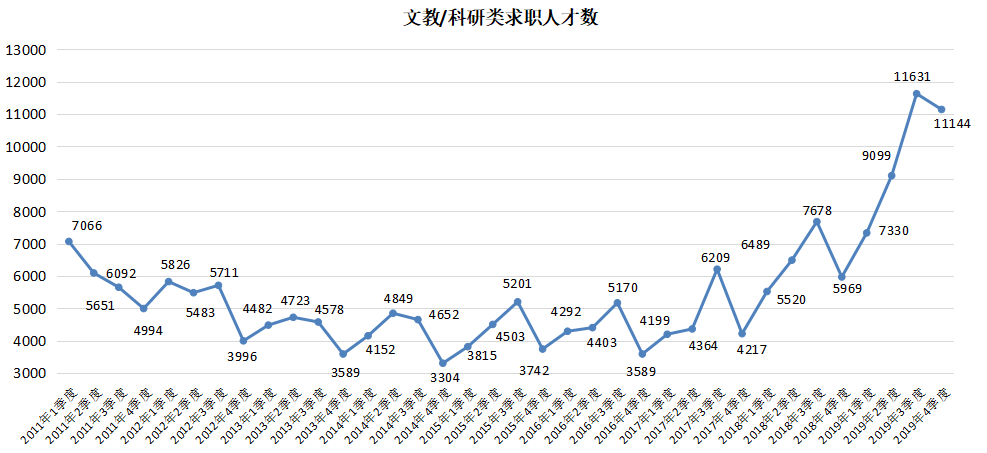 2019年第四季度,广西人才网联系统中文教/科研类职位的人才供应量同比大幅增长,其求职人才数为11144人,比上年同期增加5175人,同比涨幅达到86.70%。