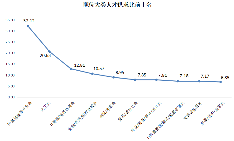 54个主要职位类型中,人才供求比大于2的职位类型高达40个,其中34个类型的职位竞争激烈,人才供求比大于3。其中计算机硬件开发类、化工类职位需求极少,就业竞争压力较大,其供求比分别高达32.12和20.63。