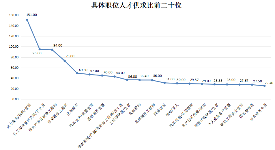 在具体职位中,2019年第四季度,火力发电/供应/管理、化工实验室研究院/技术员和房地产项目配套工程师等职位竞争较为激烈,由于需求少,这三个职位的人才供求比分别高达151.00、95.00以及94.00,均超过94人竞争1个岗位,竞争激烈程度遥遥领先。
