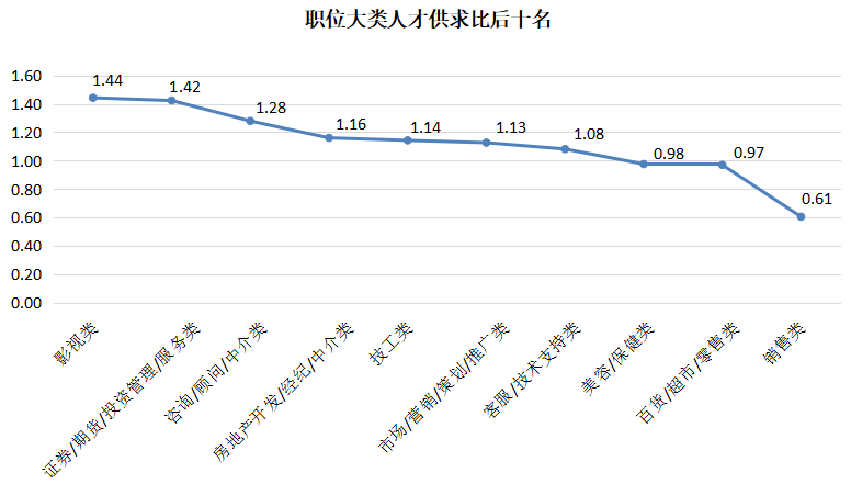 2019年第四季度,美容/保健类、百货/超市/零售类以及销售类等职位由于人员流动性大等特征,需求长期旺盛,供求比长期位居供求比排行榜后十位,其供求比分别仅为0.98、0.97和0.61,人才缺口较大。