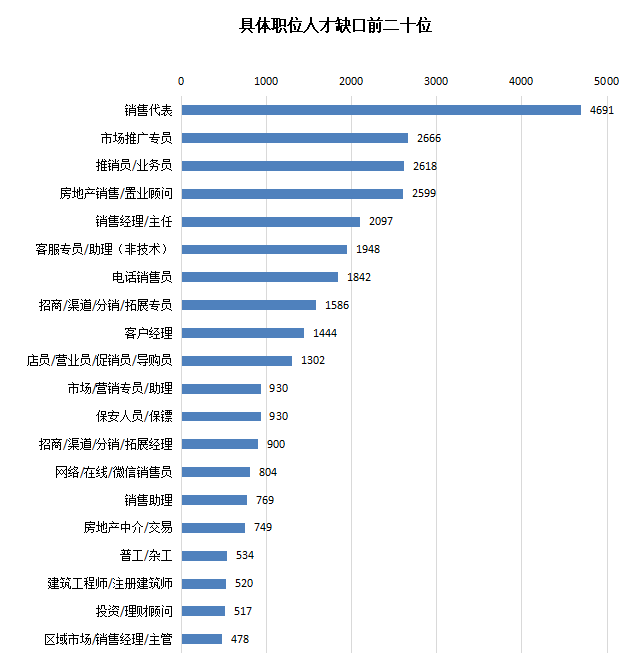 在用人单位最急需人才的前二十名具体职位中,销售类、市场/营销/策划/推广类等业务类人才最为紧缺,有将近八成职位与其挂钩。其中,销售代表、市场推广专员及推销员/业务员等职位分列前三名,这三个职位人才供给量较为缺乏,人才缺口(即需求人才数与求职人才数的差额,下同)分别达到4691人、2666人及2618人。