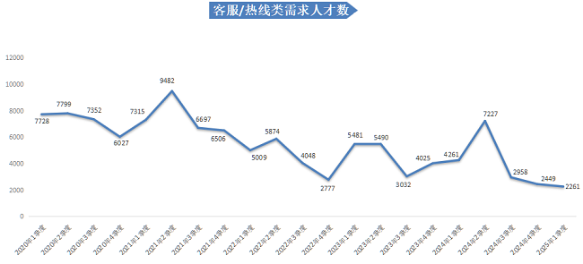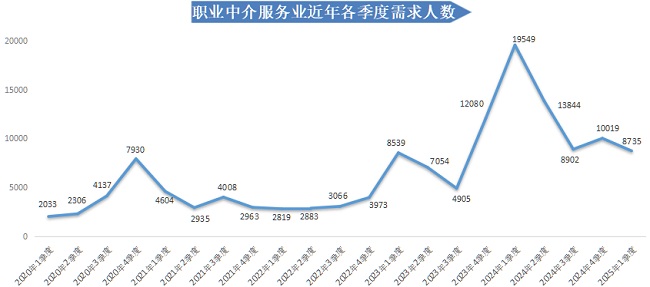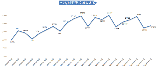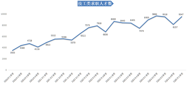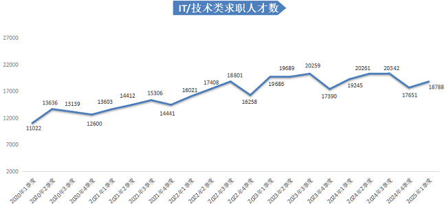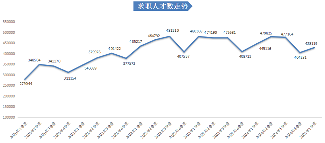 2025年第一季度,广西人才网中的人才供应量出现同比下滑,求职人才数为428119人,与上年同期相比减少16997人,同比下滑3.82%,但仍出现较明显的季节性回升,与上季度相比环比回升5.90%。