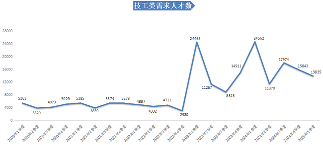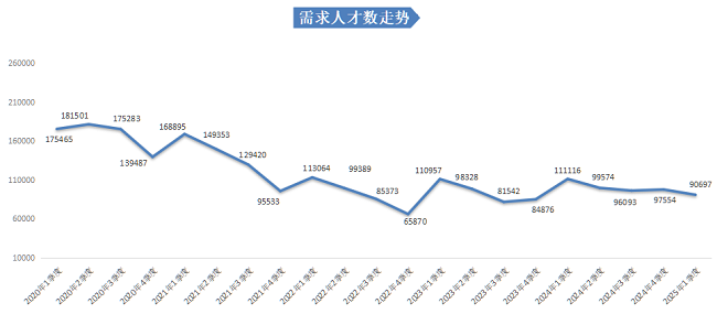 广西人才网供求数据显示,2025年第一季度需求人才数为90697人,同比下滑18.38%;求职人才数为428119人,同比下滑3.82%;总人才供求比为4.72(即人才需求人数或职位数为1时,人才供给或求职人才数为4.72,下同),比上年同期的4.01增加0.71。