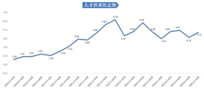 2025年第一季度,广西人才网中人才供求比为4.72,即超过4个人竞争1个岗位,与去年同期相比增加0.71,与上季度相比增加0.58,就业压力稍有增大。